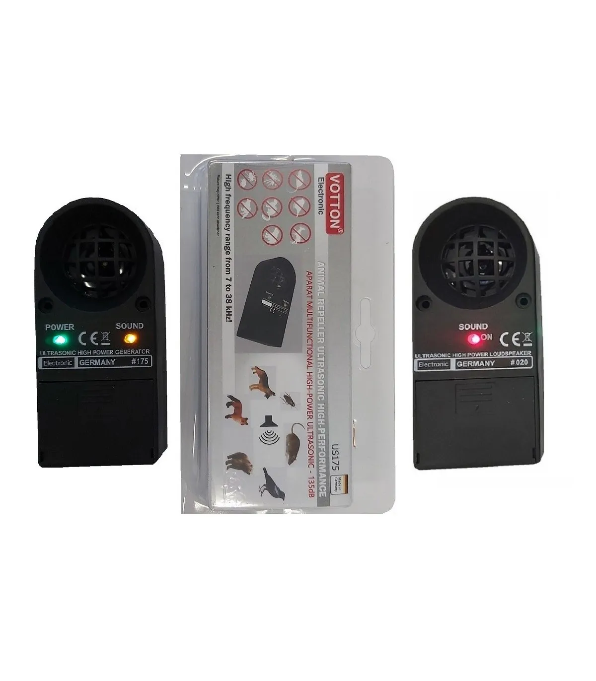 US175 VOTTON este un aparat extrem de puternic cu efect imediat asupra animalelor, este dotat cu un modul electronic ce emite ultrasunete variabile intr-un interval de frecvente foarte larg 8 kHz - 41 kHz, la o putere acustica extrem de mare de 135 dB ± 30% special conceputa sa atace direct sistemul nervos si auditiv al acestora, alungandu-le din locatie sau din zona in care este amplasat.